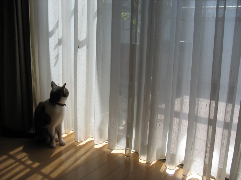 春は大好きなテラスに出てはお花の匂いをかいだり、ベリーをなめてみたり、チョウチョを追いかけたりしていたあんずも、さすがにこの暑さには勝てず・・・一度あんまり出たいとニャンニャン騒ぐので炎天下のテラスにポイッと放り出したら・・「!!!」 大あわてでとんで帰ってきました。だから言ったのに(´д`) あんずいわく、「危なく肉球ヤケドするトコだった!」・・・それ以来二度と出たいと騒がなくなったあんずでした。「今日も暑そうだわ・・」と、じぃーっと窓の外を眺める日々。