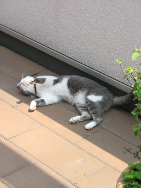 気温も湿度も高いせいか、前よりゴロゴロべたべたしてこなくなったけど、気がつくとしっぽの先だけちょっと触ってたり、お料理してる足元でひっくり返って寝てたり・・・相変わらずの甘ったれニャン。一人でお留守番が多いから、家族が家にいるとやっぱりうれしいのね☆ ちなみに今日、日曜日の朝は目が覚めたら「川の字」でした・・・さんざん起こしてムリだったのであきらめて一緒に寝たらしい・・・