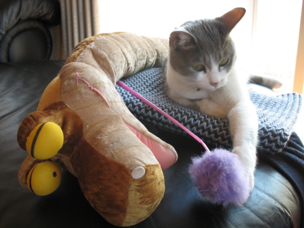 横にある奇妙なぬいぐるみの方が気になるって?ではではご紹介しましょ~う。これはあんずの2人目のお友達の「ヘビくん」。(1人目はこの間のチュウ太郎。)怒られた時に当たったりされるかわいそうなヘビくんですが、あんずの良き理解者。イジケ寝のお供には欠かせないヘビくん。